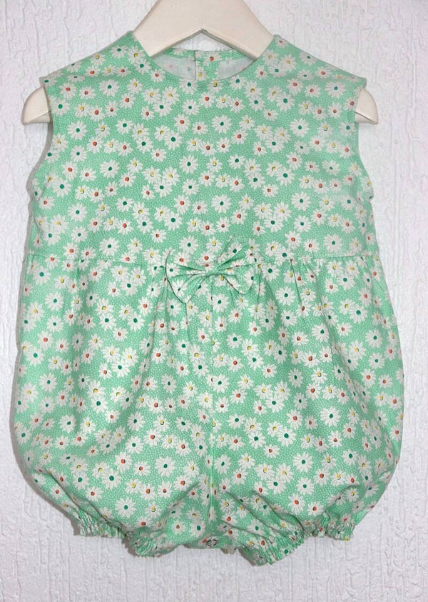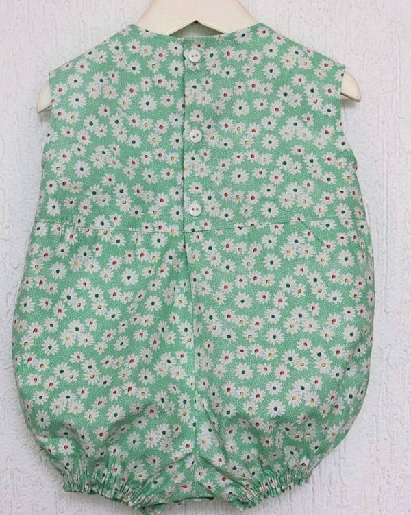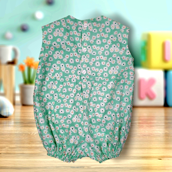 Wrap your little one in comfort and cuteness with our Handmade baby girl Green Daisy Romper, designed especially for baby girls. Crafted from soft, breathable cotton, this romper features an all-over daisy print on a calming green background, perfect for spring and summer.